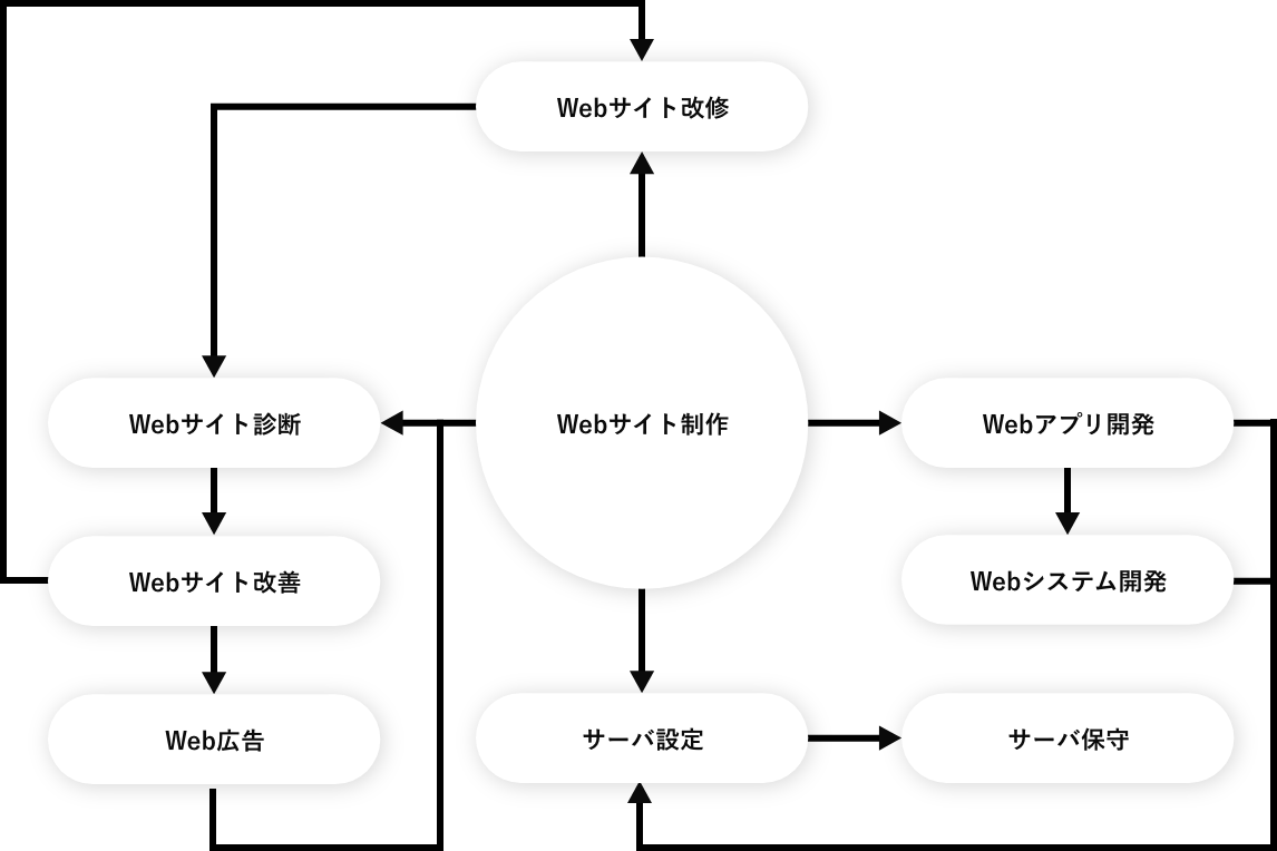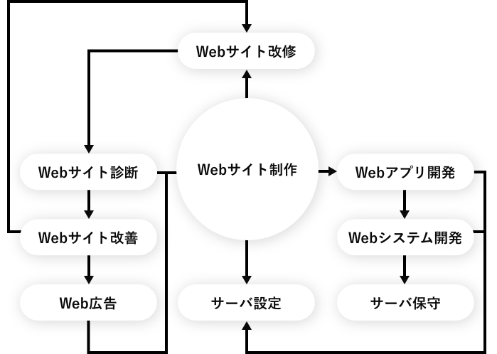 Webサイト制作を中心に関連サービスを組み合わせ、お客様の課題を解決するためのループをつくり出しています。