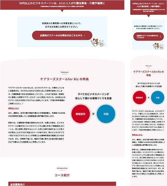今回制作した「ケアラーズスクール for Biz」は、企業の人事や研修ご担当者様へ向けたWebサイトです。メインイメージ部分に実数を多く記載することで、Webサイトを開いた際に興味・関心を持ってもらいやすい構成となっています。また「50代以上のビジネスパーソンは、2人に1人が介護当事者・介護予備軍に」という多くの企業様が他人事にできない情報と、お問合せフォームへの誘導ボタンをセットで掲載することで、ボタンクリックを促しています。対象とするユーザーが求める情報を「どのような表現で」「どのような順番で」掲載するべきかを重視し、SOMPOホールディングスのご担当者様とご相談しながらサイト構成を詰めていきました。