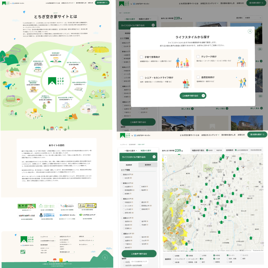 県内25市町の空き家バンク情報を一元的に検索できる「栃木県空き家バンク」をはじめ、各市町の相談窓口や補助制度の情報が一目で分かるお役立ちコンテンツ、空き家の活用・提供事例の紹介など、様々なコンテンツを盛り込んでおります。本サイトを通じて、空き家所有者の意識醸成と行動変容を促すとともに、県内への移住促進をご支援する内容となっております。