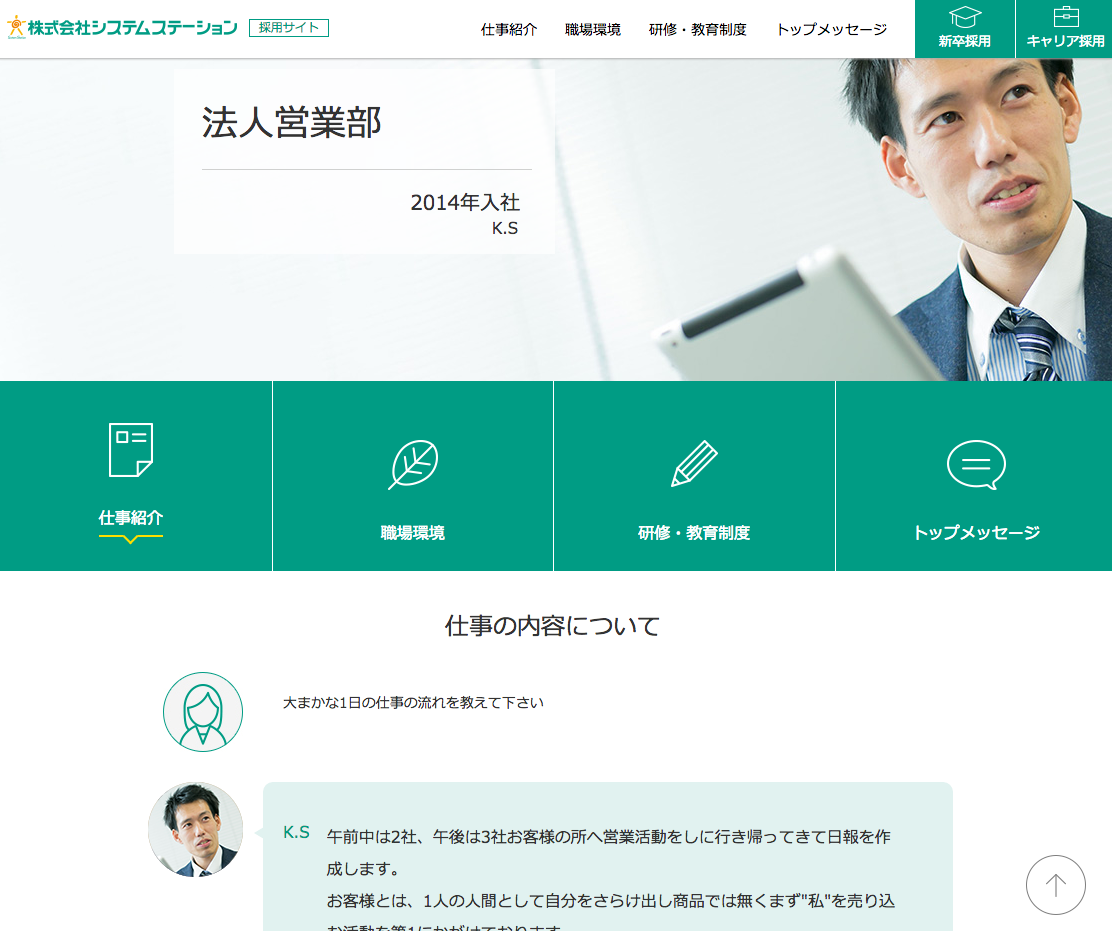 企業様のホームページも、最近ではスマートフォンによる閲覧数が増えてきています。また、採用ページにおいては、ターゲットとなるユーザーのほとんどが、インターネットの閲覧環境としてスマートフォンを利用していることもあり、PC版のデザインだけではなく、スマートフォンでも最適化されたデザインにし、利用者により便利に使ってもらいたいということからリニューアルがスタートしました。