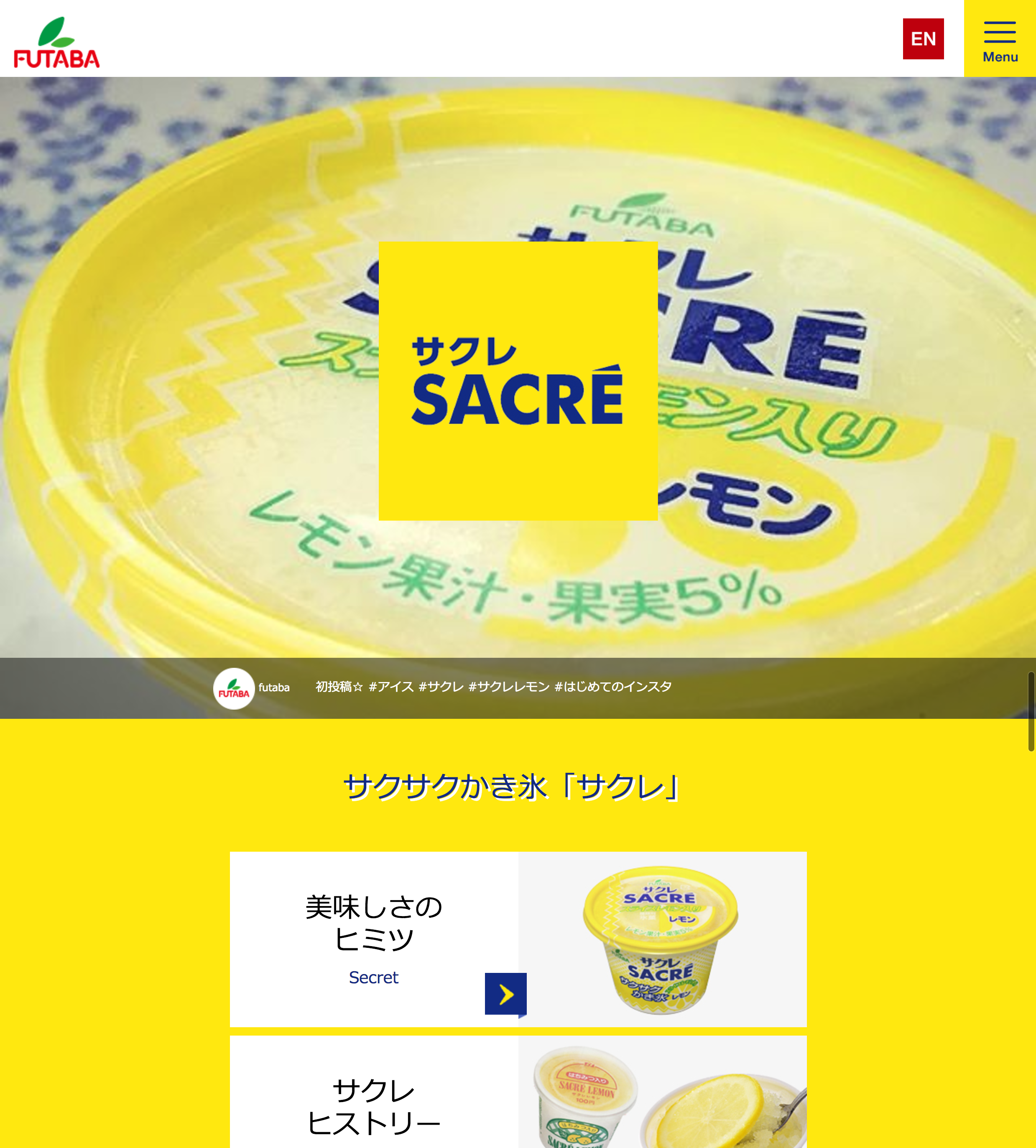 子供の頃からサクレが大好きで、フタバ食品様のサイトリニューアルに携われてとてもうれしいです! デザイナーとして参加させていただきましたが、サクレを食べる時のようなわくわく感を表現しつつも、他のサービスや商品もしっかりご紹介できるように、サクレのレモンを食べるタイミングのようにバランスを考えながら作りました。