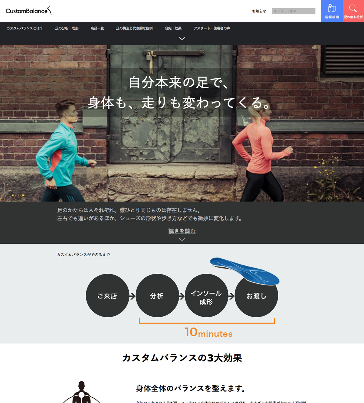 カスタムバランスの商品認知を高めるとともに、商品の魅力を伝え、商品への興味をもっていただけるホームページにすることを目的として、サイトリニューアルのプロジェクトがスタートしました。カスタムメイドできるインソールの認知度はまだまだ少ないということもあり、どのような特徴があり、どういったユーザーに喜ばれるのかを、どうやったらわかりやすく伝えられるのか?お客様とともに悩み考え制作を進めていきました。