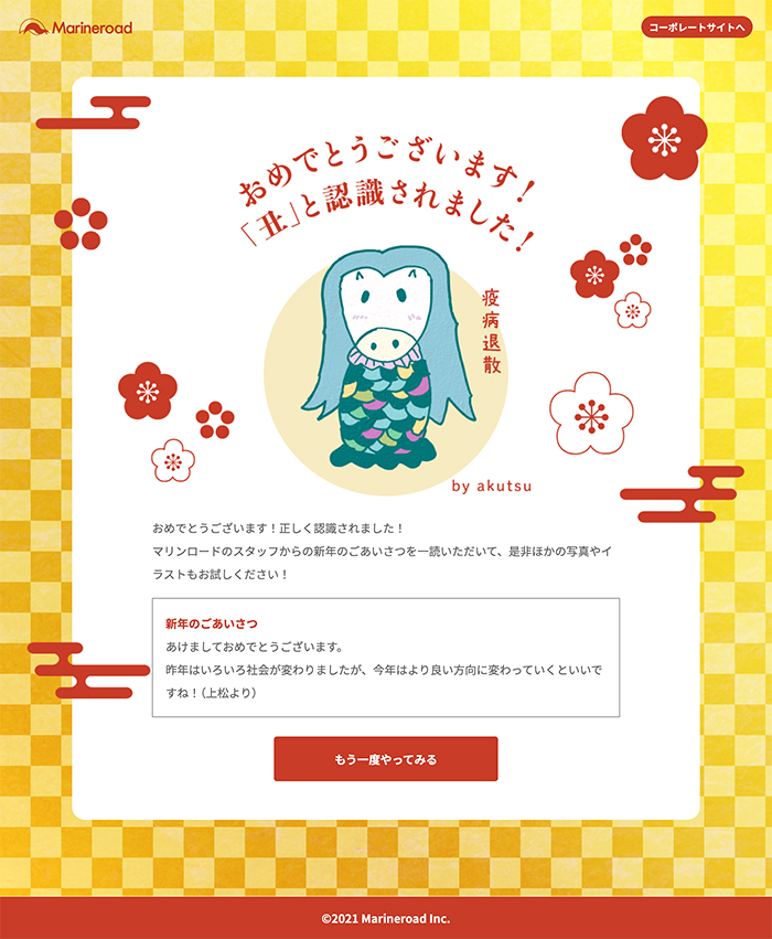 丑の写真やイラストをアップしてAI画像認識を楽しもう!マリンロードのお正月コンテンツ2021